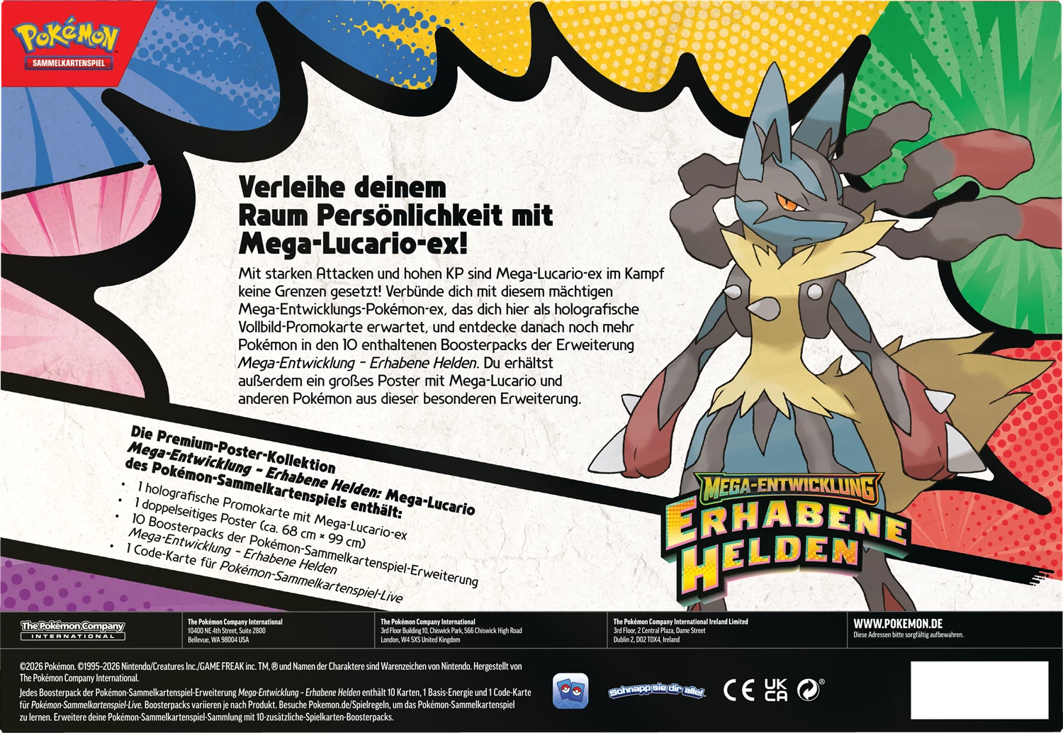 With strong attacks and big HP, Mega Lucario ex and Mega Gardevoir ex break through boundaries in battle! Team up with one of these powerful Mega Evolution Pokémon ex as a full-art foil promo card , then find even more Pokémon inside a stack of 10 booster packs from Mega Evolution—Ascended Heroes. You’ll also get a large poster showing off Mega Lucario or Mega Gardevoir and other Pokémon featured in this special expansion.